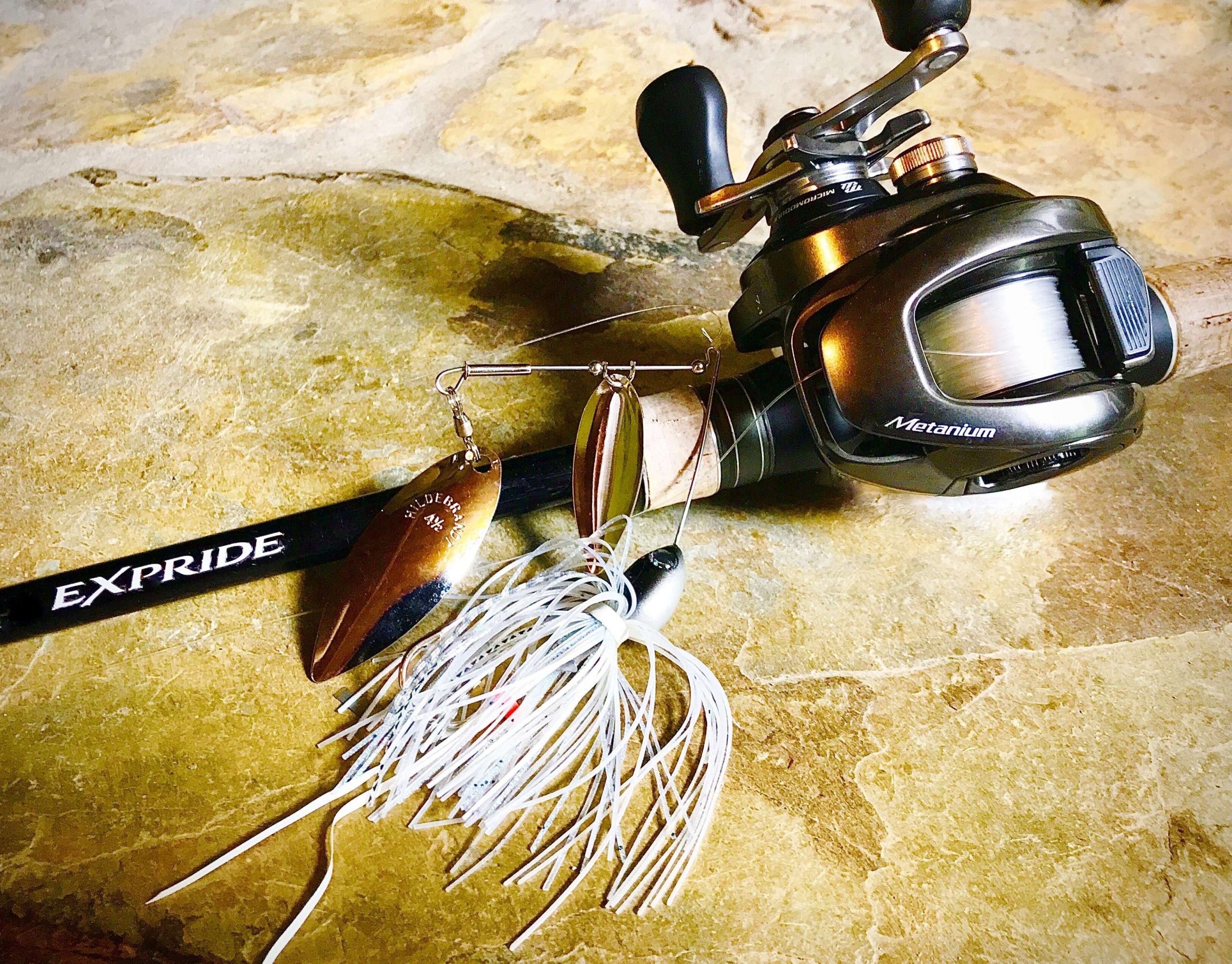 My personal preference includes a Shimano 7-foot, 2-inch Expride casting rod in a medium-heavy action with moderate-fast tip. That length and action is ideal for casting big blade baits, as well as taking up slack on long distance hooksets. And I can feel every pulse of the lure as the blades turn. I pair it with their slower, 6.2:1 ratio Metanium MGL III reel, which allows me to retrieve the spinnerbait at the right rate of speed — assuring that it stays deep throughout the retrieve. The Metanium’s magnesium frame telegraphs even the most subtle vibrations, so I know what the lure is doing at all times. And it has the guts to handle big baits and big bass in thick cover.