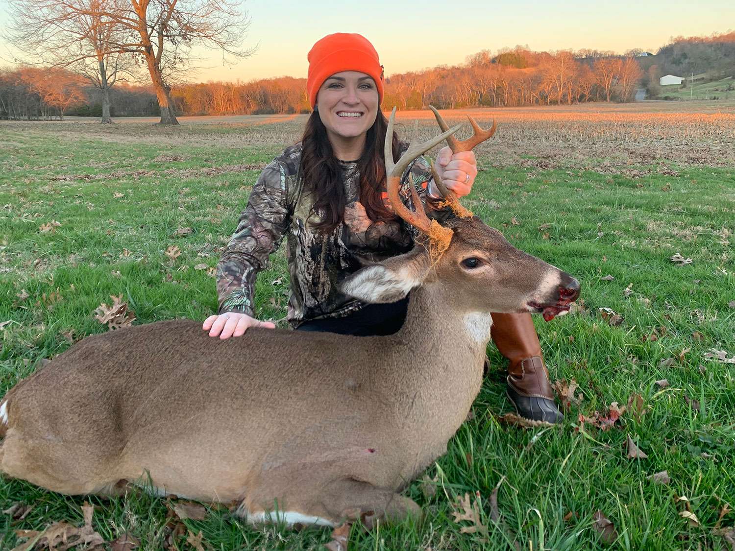“There was a fallen tree, and we sat on ground,” Kim recalled. “I had a spike walk right beside me. (A spike is a 1-year-old whitetail buck.) It was so close, we could’ve reached out and touched it. About 30 minutes later, a doe stepped out. Brandon counted ‘1, 2, 3. Breathe. Now shoot.’ I dropped her right there. He was freaking out for me, screaming how it was the perfect shot.