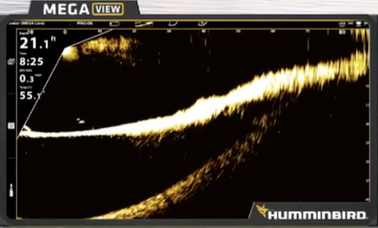 Here’s a shot from Jeff Gustafson’s Humminbird graph that perfectly illustrates what he’s been doing all week. Gussy is sitting in 21.1 feet of water, as is indicated in the top left corner of this shot. In the bottom left quadrant, we can see two marks. The higher, smaller mark is Gussy’s Smeltinator Jighead/Z-Man Jerk ShadZ combo. The bigger one just below and to the right of his bait is a smallmouth.