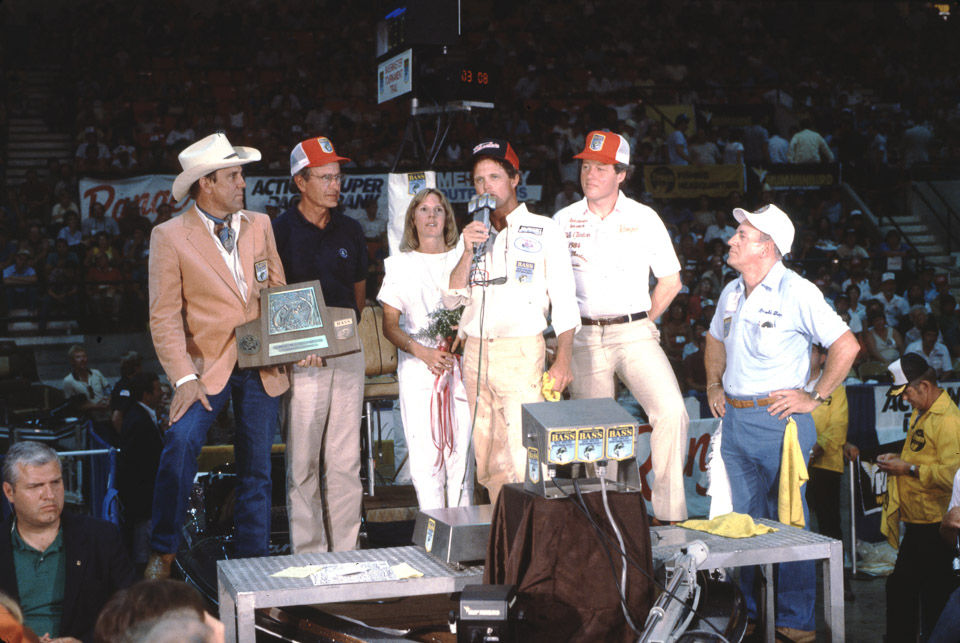 On the final day, B.A.S.S. president and emcee Ray Scott had already whipped the crowd of into a frenzy before Clunn entered the arena. Adding to the energy were the likes of Clinton and Bush. Clunn awaited outside the closed arena door and when it opened the crowd became even more boisterous, expecting even more heroics from Clunn. With every fish he pulled out of the livewell the crowd got louder.