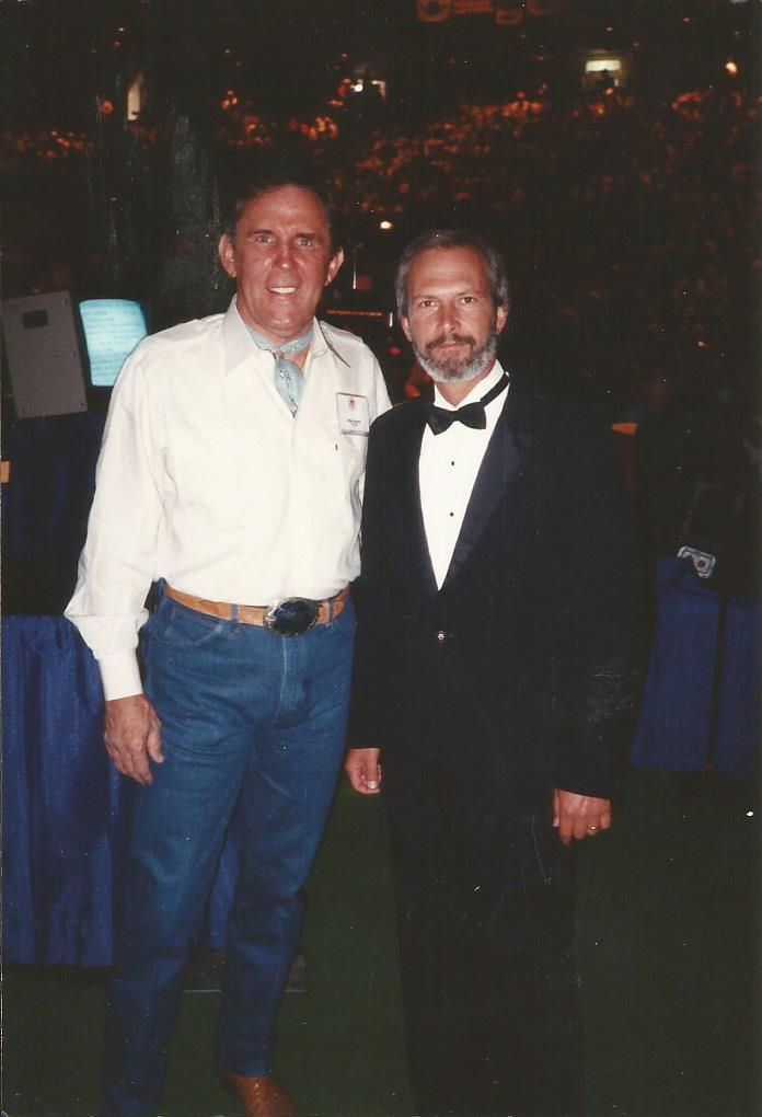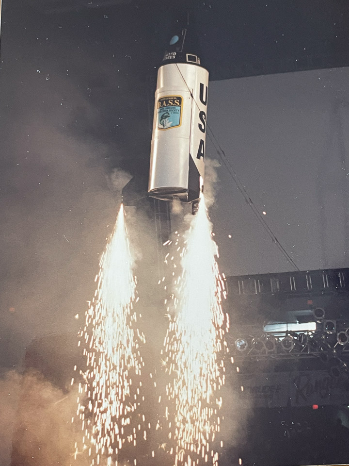 In 1988, B.A.S.S. added the 30-minute show prior to the final day weigh-in. The budget was impressive as was the patriotic parade of characters, performers and bands, all performing amid laser lights displayed in the darkened arena. B.A.S.S. hired Day as the emcee, and he embraced the role above and beyond his primary role. Wearing a space suit and riding in the model rocket ship tethered to a cable was among the call of duty. So was a stunt requiring Day to zip-line from the arena ceiling, break through a suspended B.A.S.S. paper banner and land on the deck of the bass boat used as the weigh-in stage.