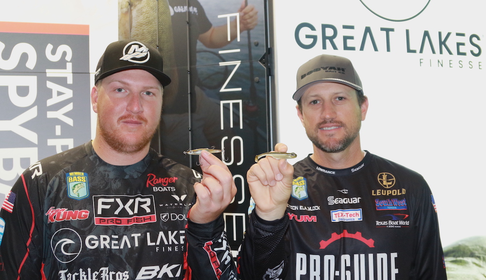 Elite pros Evan Kung and Stetson Blaylock display two new Great Lakes Finesse baits — the Stay Pinned Spybait and the 3.25-inch version of the Drop Kick Shad.