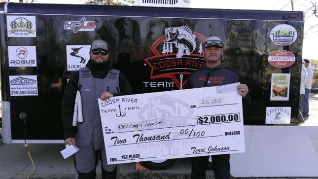 It took 16.63 pounds to win and 13.41 pounds to get a check, big fish was 7.0 pounds, we paid a total of 13 spots plus big fish. The first place winners were Russ Sapp and Logan Sims with 16.63 pounds.
