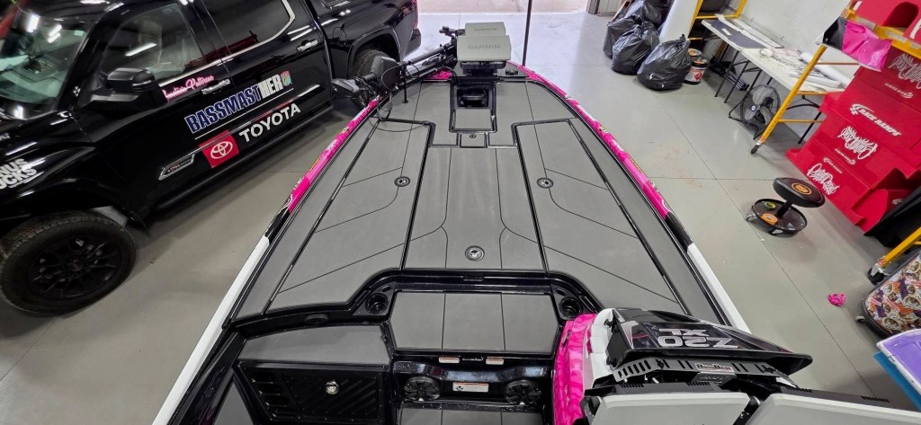I brought this boat to life with the help of the great folks at Bass Pro Shops and One Eleven. I mixed in the cheetah print and the sneaky blue and white, which yes reminded me of colleges, but truthfully are two of my favorite colors and are also an ode to the movie Anastasia. (If I ever make the Bassmaster Classic, the iconic blue dress is also a must.)