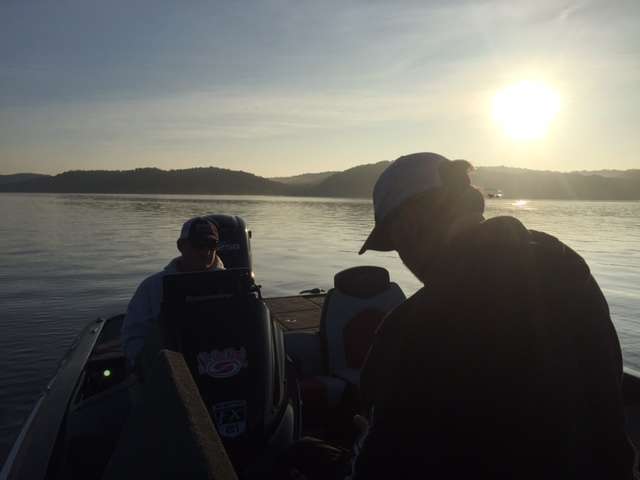Steve Bowman, Crispin Powley and I have traveled back to the south end of Kentucky Lake. It's a beautiful, calm day. On the ride down the water was nearly as smooth as glass. We've arrived ahead of the anglers. So we've got a little time to eat a biscuit, drink a little coffee, and listen to some funny music provided by Powley. A great start to Day 2.
