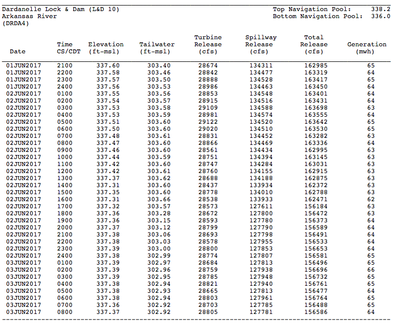 As you can see above from the U.S. Army Corps of Engineers’ website, Lake Dardanelle’s water level stabilized overnight after dropping steadily yesterday.