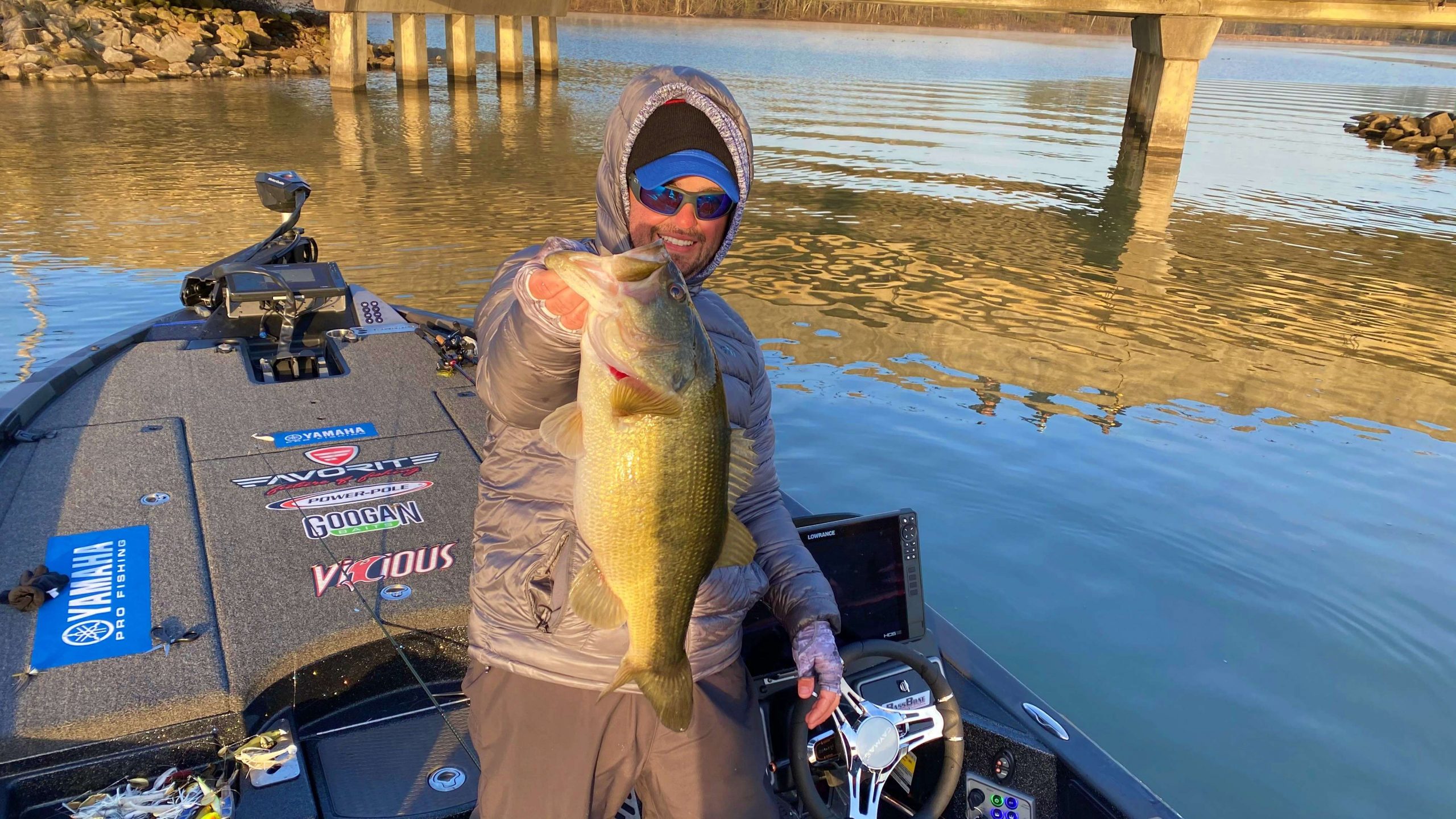 Maybe Lake Guntersville is saving its best for the last day of the 50th anniversary of the Bassmaster Classic. If the first hour is an indication, that may be the case. In the photo above, Skylar Hamilton holds one of the four 5-pound bass recorded on BASSTrakk. Hamilton’s is the biggest so far, recorded as a 5-7. In the photo below, Lee Livesay displays another 5-pounder. Todd Auten and Stetson Blaylock also have 5-pounders on the leaderboard early.