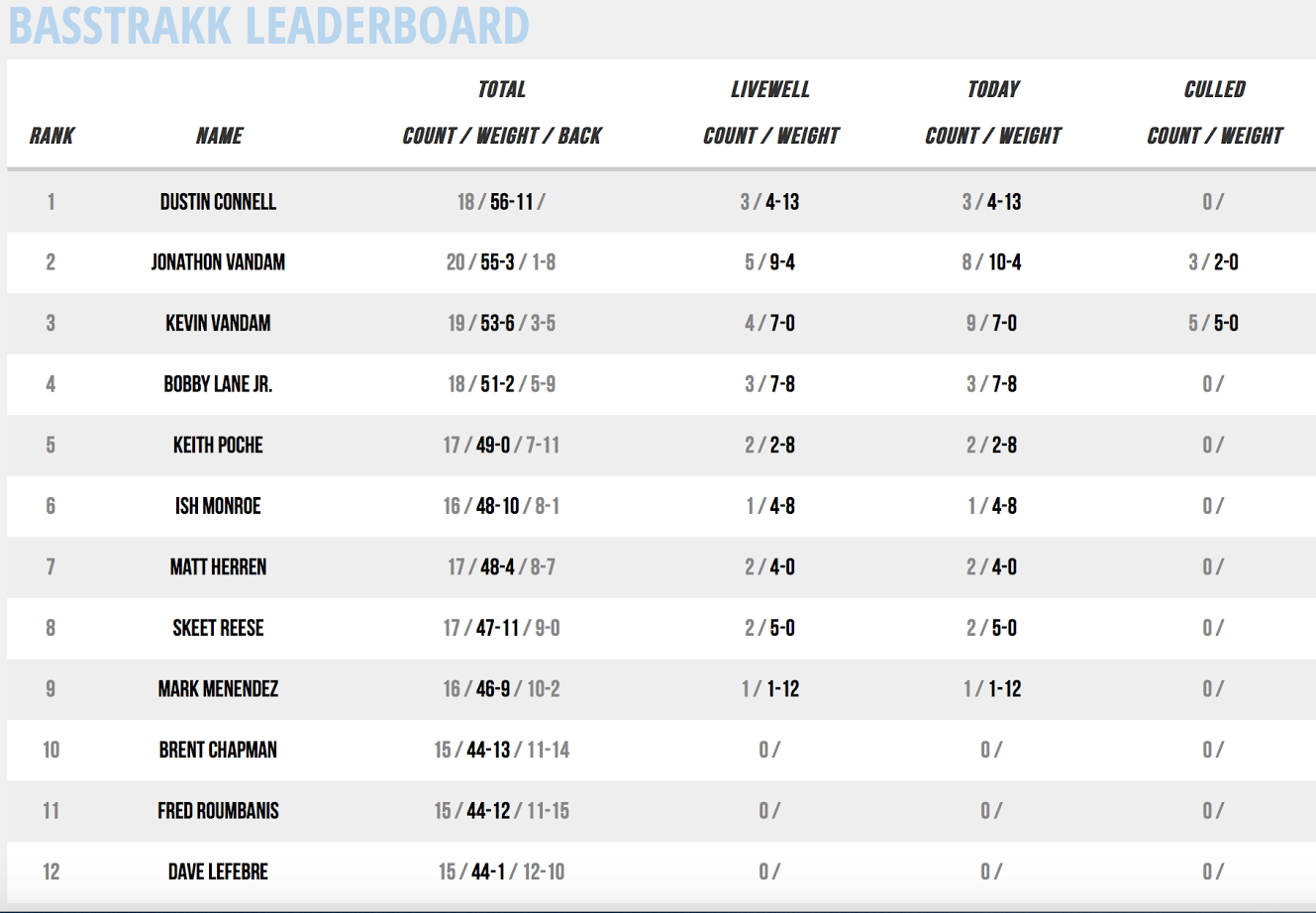 Dustin Connell’s bite appears to be heating up, he now has three bass for 4-13. He’s sitting unofficially in the lead. Jonathon VanDam has moved into second on BASSTrakk with a limit at 9-4. That’s the big bag of the day at this point. JVD started the day in fourth place, and has moved ahead of his uncle Kevin VanDam, and Keith Poche.