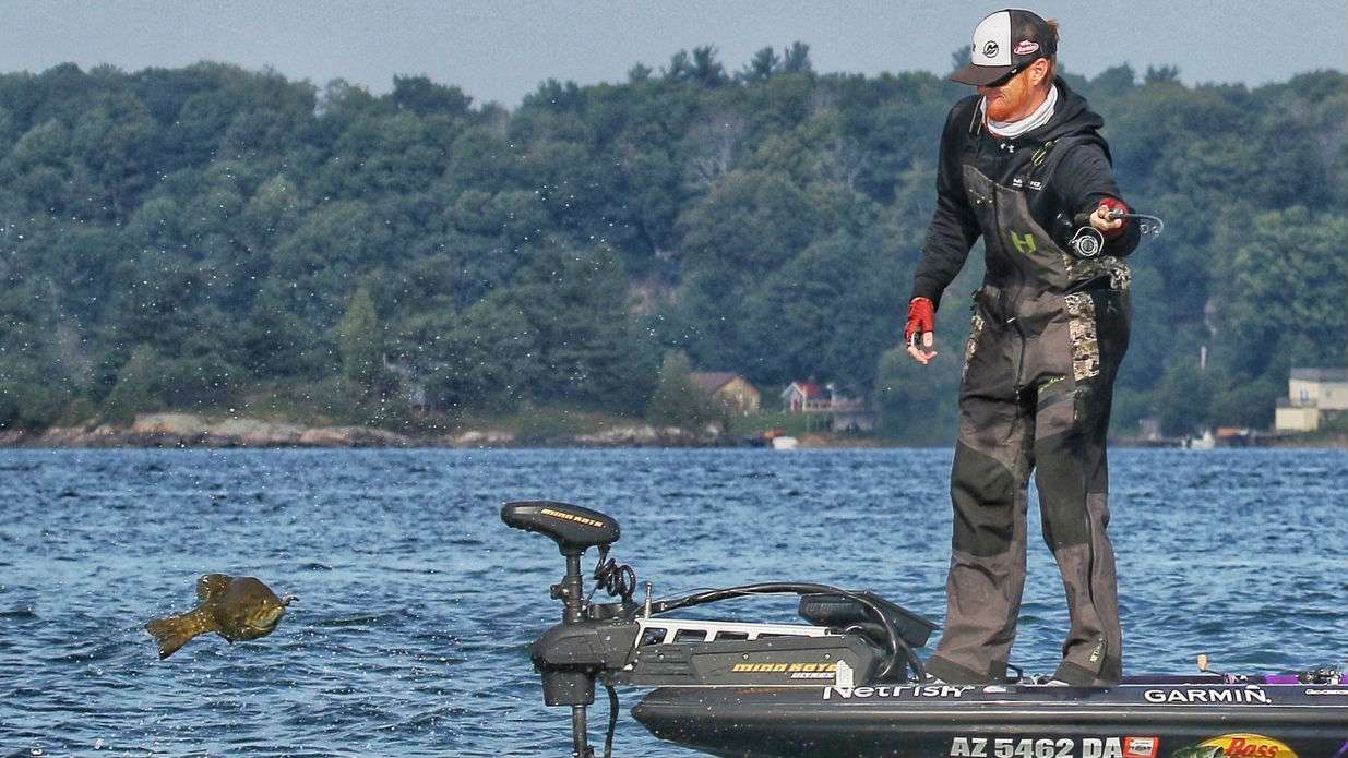 They’re continuing to battle it out today. As you can see from Gettys Brannon’s photo above, Bertrand landed one of those St. Lawrence lunkers that practically jumped over his trolling motor.