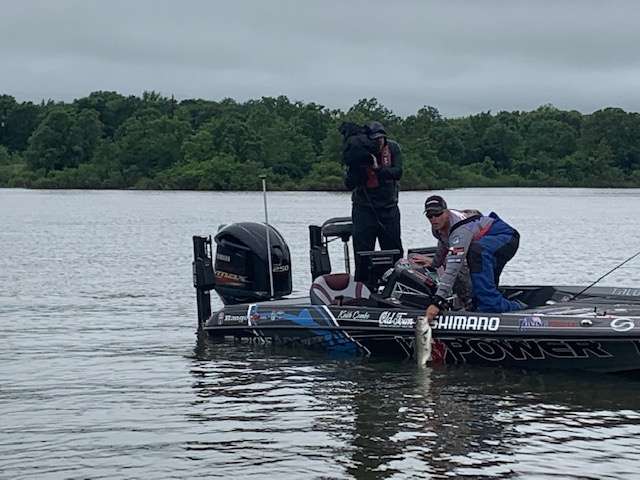This morning Steve Bowman and I are covering Keith Combs. It has been a slow start for the tall Texan. Nary a bite for the first two hours. At least we got a nice tour of the lake. Combs has fished six or seven spots already. But he just hooked up and landed a 4 pound 4 ounce bass. That lightened the mood, and brought about a pleasant exchange. Bowman, “Keith it’s about time.” Combs, “I’m already tired of you.” Both said with brotherly love.