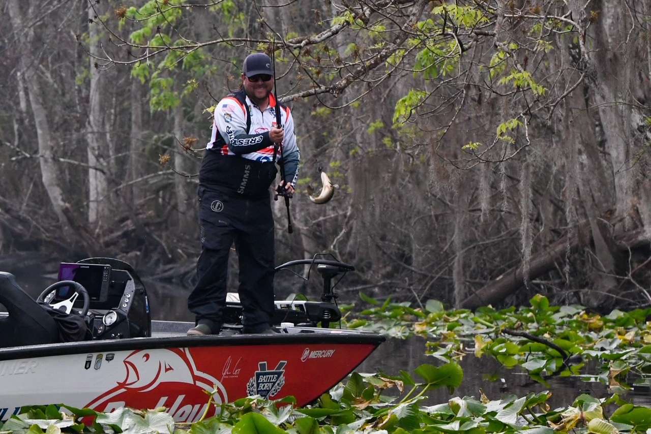 John Cox just spent about 45 minutes on one spawning bed. He caught the male pretty quickly and adjusted several times to try to get the female to play, but he finally moved on. He gave no indication of how big the female was, but it’s obvious the bass are on the beds.