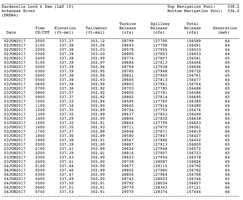 If you’re watching “Bassmaster LIVE,” you heard Kevin VanDam note that the water was a couple inches higher this morning than when he left it yesterday afternoon. That’s definitely the case, as you can see from the accompanying U.S. Army Corps of Engineers chart for Lake Dardanelle.