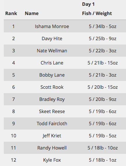Ish Monroe’s 108-5 winning weight in 2012 was kick-started with a Day 1 bag of 34-5. Both numbers were headline-grabbers and well outside the norm. Chris Lane finished second with 95-9. But you only have to go down the leaderboard to third place to see a total more in-line with expectations this year, where Skeet Reese had 84-12.