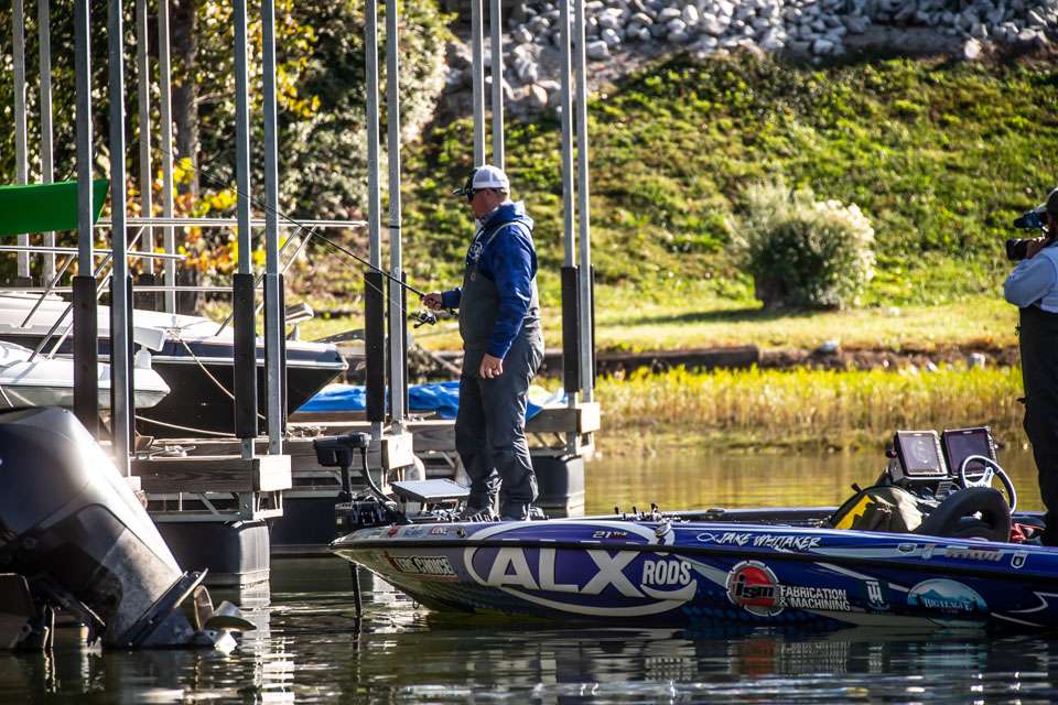 What’s interesting is how well Whitaker has the details of his bite dialed in. He discovered the baitfish are swimming in the shade cast by the roof of the marina slips. They get nabbed when swimming near the boat slips and walkways being used by largemouth as ambush points.