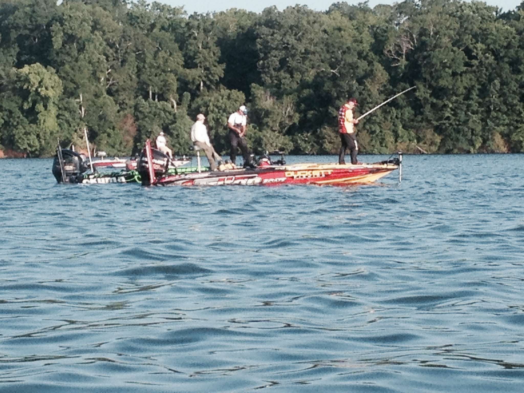 About a mile away the setting and mood is more peaceful. Boyd Duckett and Jeremy Starks are side by side swapping ideas. Nearby is Brandon Palaniuk. They are surrounded by about a dozen spectator boats.