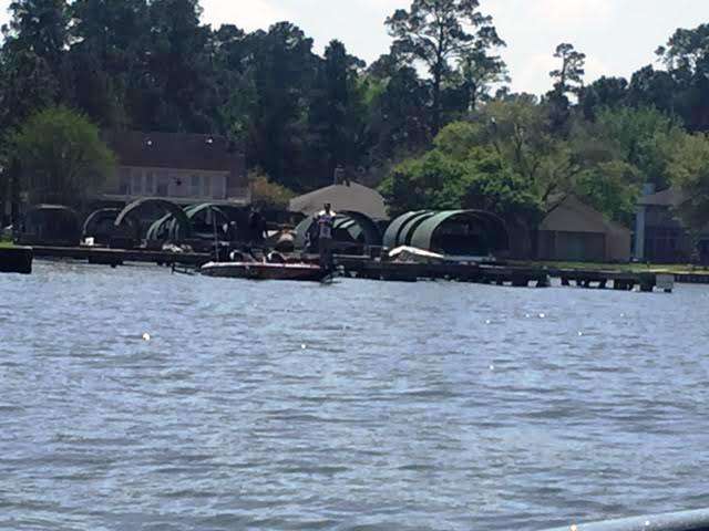 About noon Edwin Evers abandoned his morning pattern of fishing seawalls and docks with a swimbait and turned to sight fishing. He drove back into a residential cove and set up shop. Fishing close to the bank he has had the Power-Poles down in the exact same spot for 90 minutes. The fish he’s seeing must be a giant to spend this much time on it. He’s tried different baits and has spent some of the time fishing from his knees.