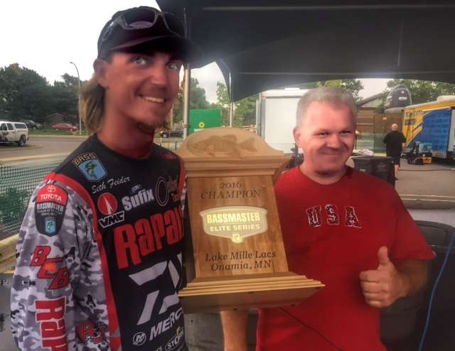Seth Feider backstage right after he tamed Mille Lacs, posing with his new trophy, alongside the man who created it, Steve Tretter. “I’m glad we get to keep it in Minnesota,” said Feider.