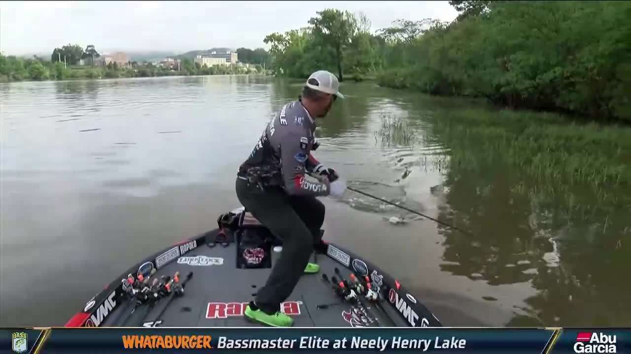 First, Gerald Swindle put a solid 12-pound, 10-ounce limit in the boat, then Paul Mueller landed what appears to be the biggest bass of the week, entered in BassTrakk as a 6-pounder. The bite has been different every day at Neely Henry. Today is no exception. Mueller mentioned the riprap bank where he caught the big one this morning had been too shallow earlier this week. Apparently, it’s now just right.