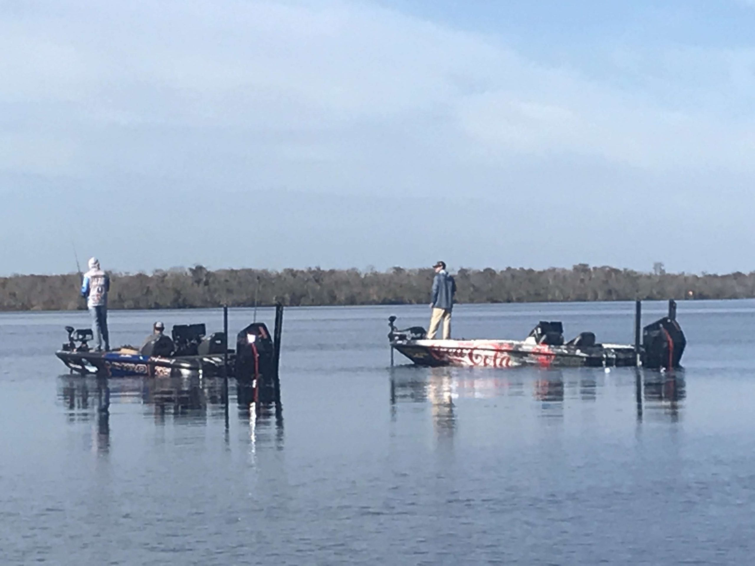 Micah Frazier is showing up as a zero on the BASSTrakk leaderboard, but that’s because he doesn’t have a marshal today. Apparently he does have about 16 pounds though, which would put him in the lead, unofficially. Photographer Andy Crawford reports that Frazier just culled a 2-pounder with a 3-pounder.
