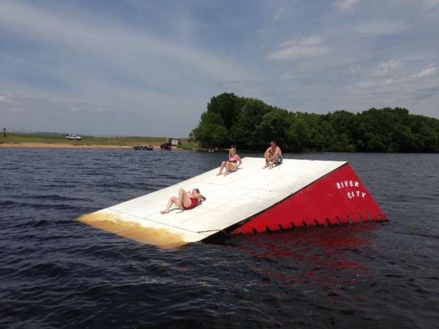 While the Elite pros and B.A.S.S. staffers were working hard today here's what some of the locals were doing– hanging out on a giant water ski jump in the Black River. That water is nice and cool on a hot summer day!