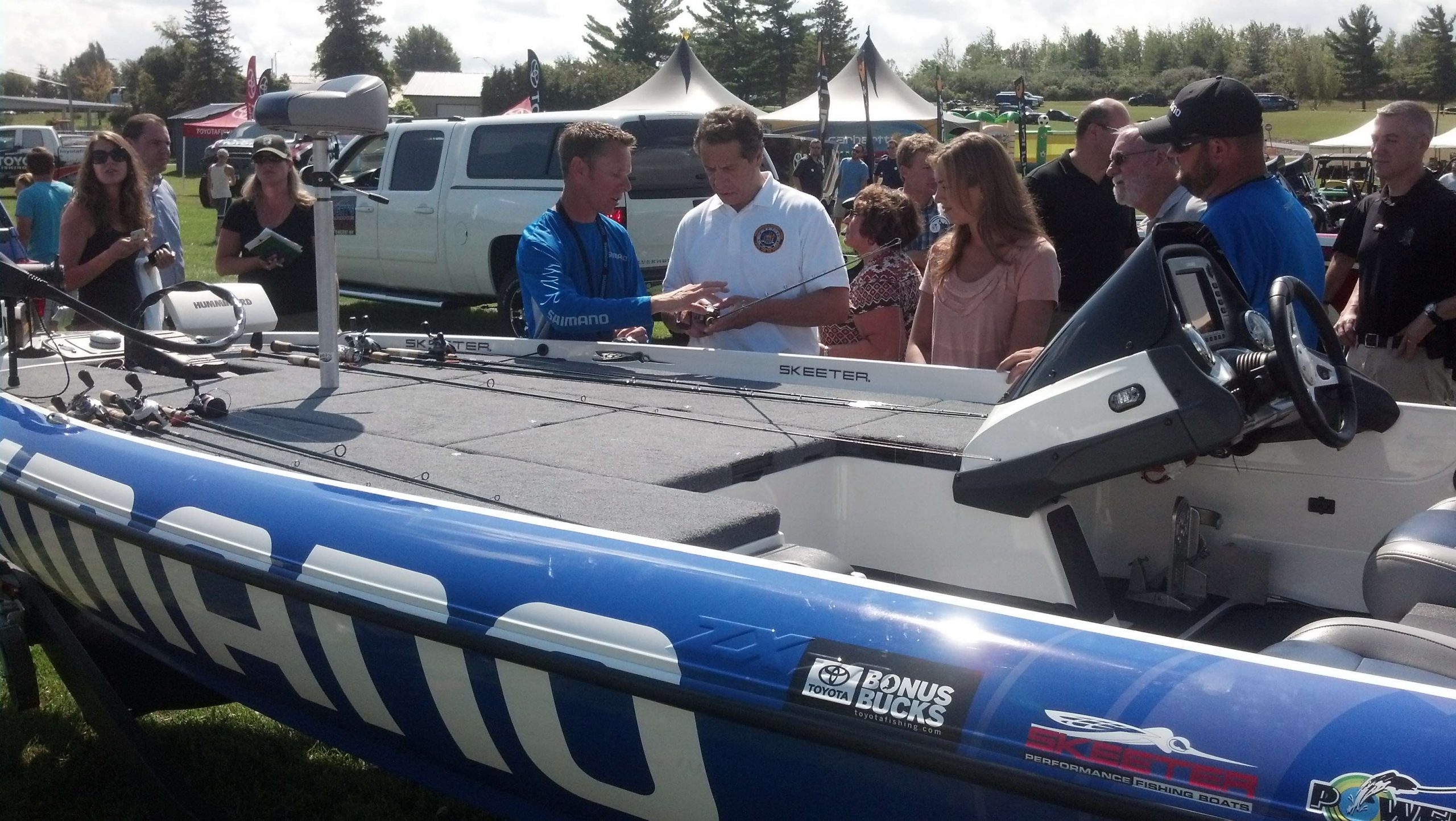 These three photos are from New York Governor Andrew Cuomo's visit today to the Elite Series tournament in Waddington, N.Y. After the press conference, he visited with three B.A.S.S. sponsors: Shimano, Toyota and Yamaha.