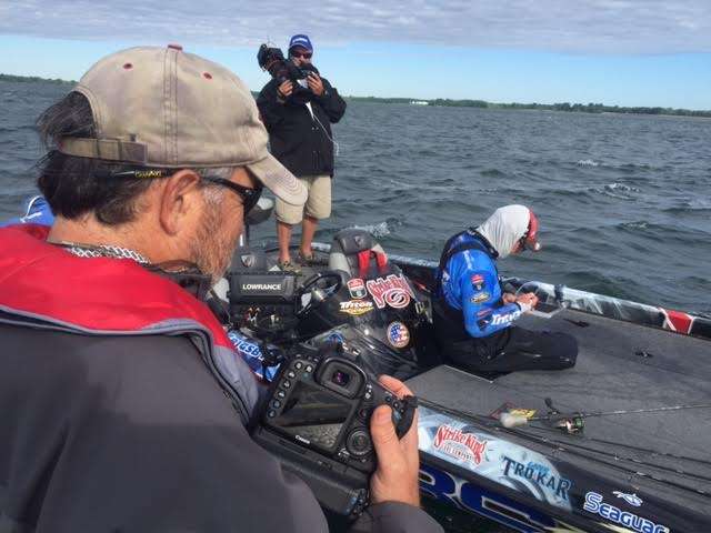 As you’ll see in the photo, Shaw Grigsby has paused to re-tie. That’s Bassmaster LIVE cameraman Rick Mason in the boat with him, and my boat mate Steve Bowman is in the foreground. Grigsby tells us his response to the heavy wind is to throw heavier weight. “I’m throwing the heaviest stuff I own,” he said. The only problem with that is the heavier tackle is getting hung up more on the bottom, and Grigsby has broken off several times.