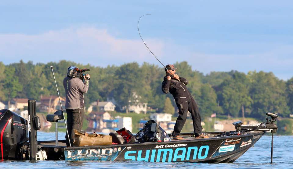 Jeff Gustafson continues to struggle—like his peers—to put quality fish in the livewell. His BASSTrakk score looks like this: 2-0, a pair of fish weighing 3-4 and a two pounder. He originally planned to first stop on a smallmouth area that reenergized after he went there late yesterday afternoon. That spot has what he described as bigger fish, yet they aren’t yet there.
