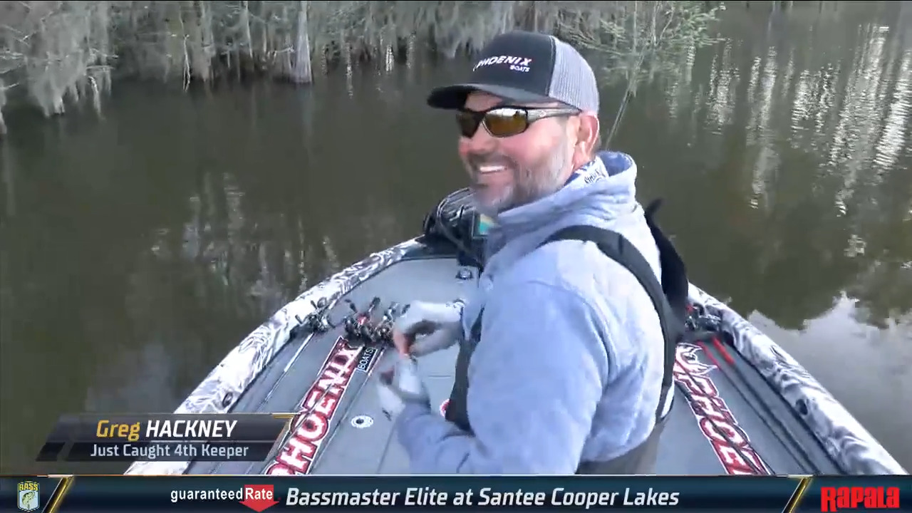 Greg Hackney entered the day in third place and is off to a quick start again on Lake Marion. At 8:15 he landed his third keeper of the day and shortly after landed his fourth, a good-0sized bass. Hackney is in the same area of the lake he started in yesterday, pitching a Strike King Rage Bug at shallow cover for spawners. He isn’t sight fishing, however. His last bass was entered into BassTrakk as a 4-pounder and is unofficially leading the tournament at this time.