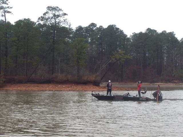 Roy Hawk is slowly building a limit. He had three keepers in the livewell for approximately 4 pounds 7 ounces. All three have been caught pulling a crankbait across points. In between he has spent a fair amount of time fishing in pockets with nothing to show for that effort.