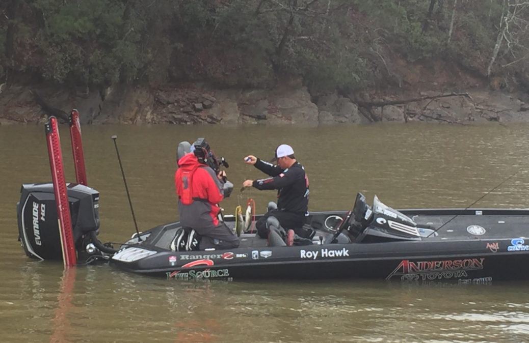 Roy Hawk just landed a 3 pound spotted bass and culled up more than two pounds. He’s got 8-15 in BASSTrakk now, moving up to third place. He caught this one off a natural rock wall on a lake point. He’s still using the Duo Realis crankbait on 12 pound test line.