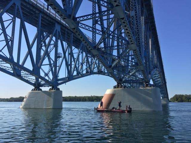This is a beautiful area of the river, with the mist plume of Niagara Falls rising downstream, but the noise factor sucks. The whine of vehicles continuously crossing the heavily trafficked bridge is obnoxious. Obviously, Brett Hite and the smallmouth bass aren’t bothered by it one bit.