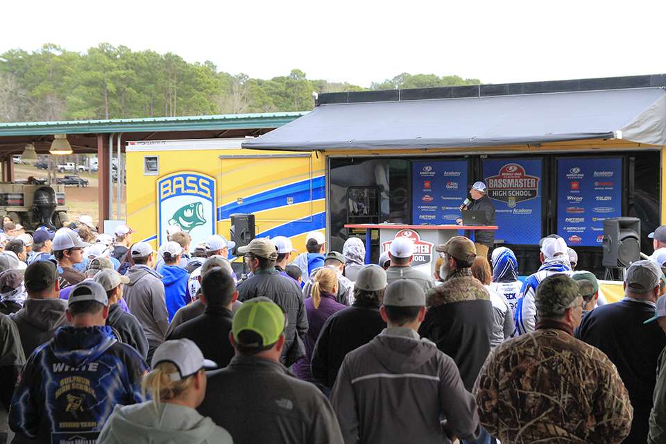 Hank Weldon conducts the Mossy Oak Fishing Bassmaster High School and Junior meeting/registration at Cypress Bend Park on the shores of Toledo Bend.