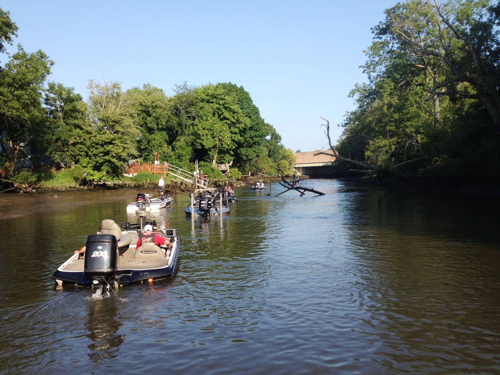 Mike Iaconelli wasn't able to coax another bite while working his way up Woodbury Creek. Now he and his entourage are headed back toward the Delaware River. He just made one quick stop. There's no telling where he is going next.