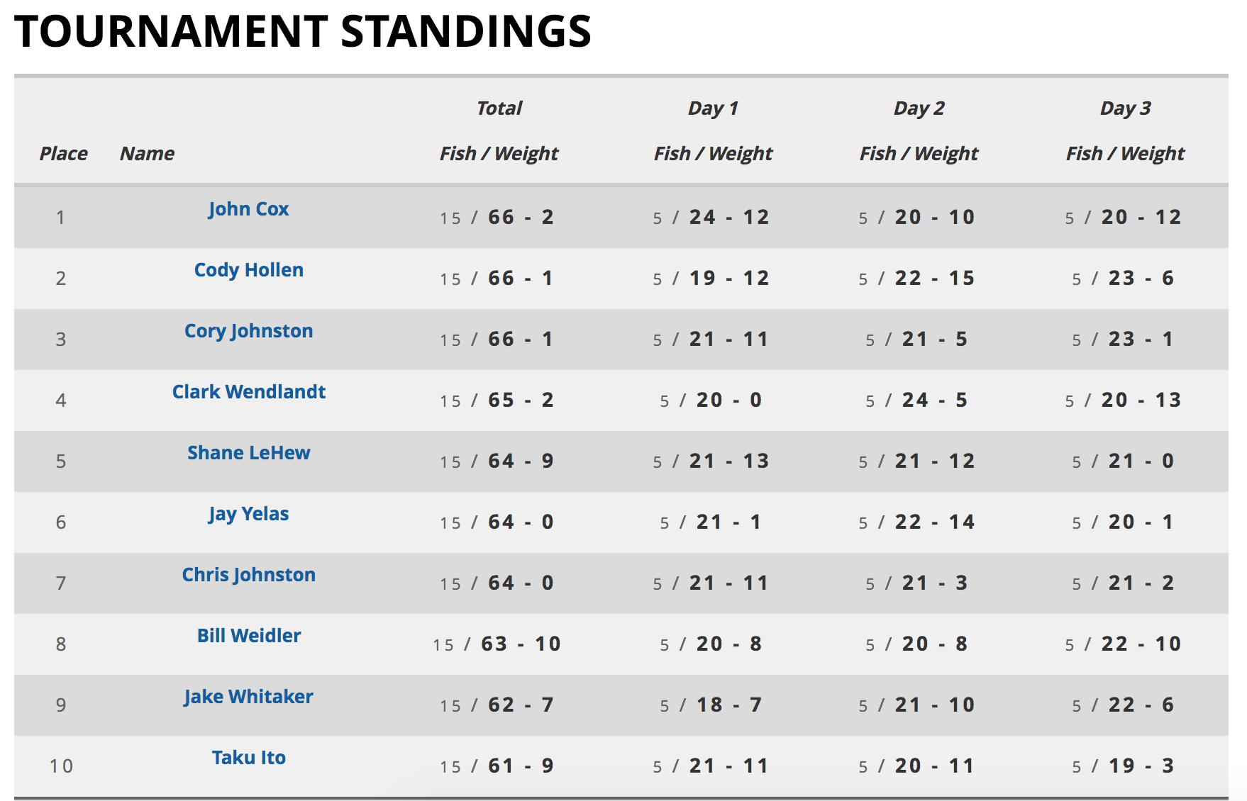 This would be the definition of a bass tournament shootout: When a mere one ounce separates the top three anglers after three days at Lake St. Clair. For the third day in a row, John Cox is atop the leaderboard. His three-day total is 66 pounds, 2 ounces. Cody Hollen and Cory Johnston are as close as you can get behind him with 66-1 each.