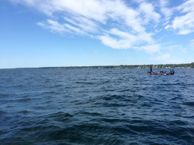 Steve Bowman and I just caught up with Josh Bertrand. That's him fishing in the middle of the big, blue St. Lawrence. I'm still amazed at the size of this body of water. Even though I knew it was big. In person it's bigger.