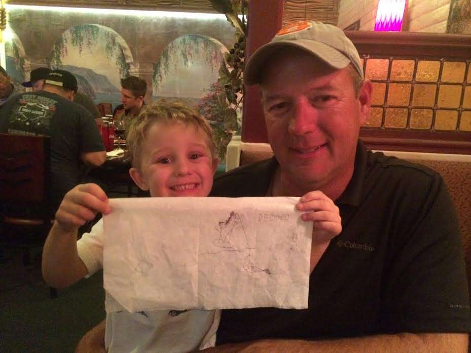 With him was his wife, Julia and kids, Sophia and SJ. SJ is quite the artist. While Steve and I were talking about how many fish he wasn't catching on a swimbait, SJ was drawing on a napkin.