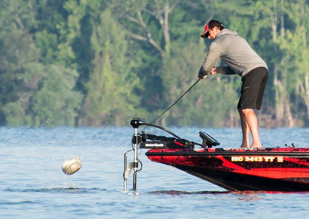 Kevin VanDam returns to the spot that started his Day 1 flurry, and finds success. Cliff Pirch arrived first, but unless he caught one very quickly before we arrived, KVD is the first to strike. The two anglers are sharing an offfshore ledge together. Unlike yesterday, there's also about 12 spectator boats surrounding the two anglers. I guess someone has been reading our blog?