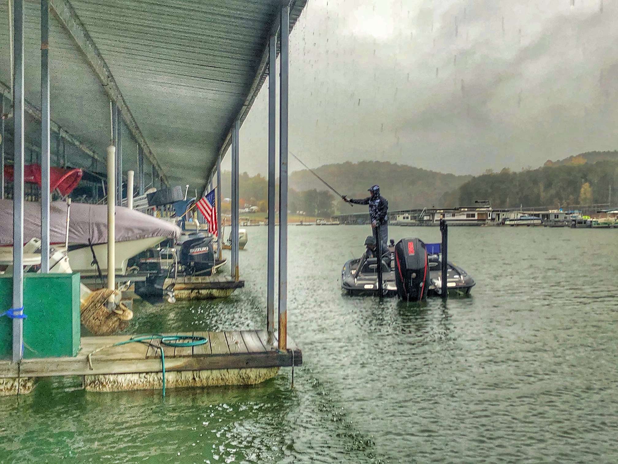 Brandon Lester already has two small fish in the boat despite the hurricane. He’s pitching a top water bait inside a marina along side pontoon boats.