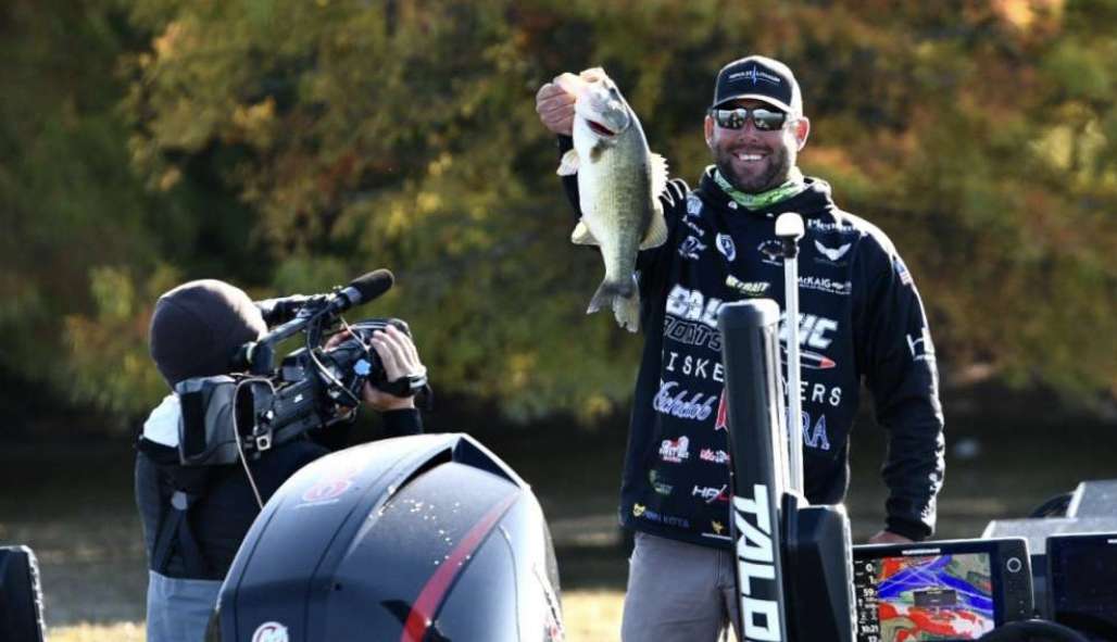 Lee Livesay became the first angler in today’s 40-man field to catch a five-bass limit. Unofficially, he’s got over 13 pounds and has the lead. Livesay was hopping a frog across a mat when he said, “I can’t believe I can’t get bit right there.” And boom, No. 5 blew up on the frog.