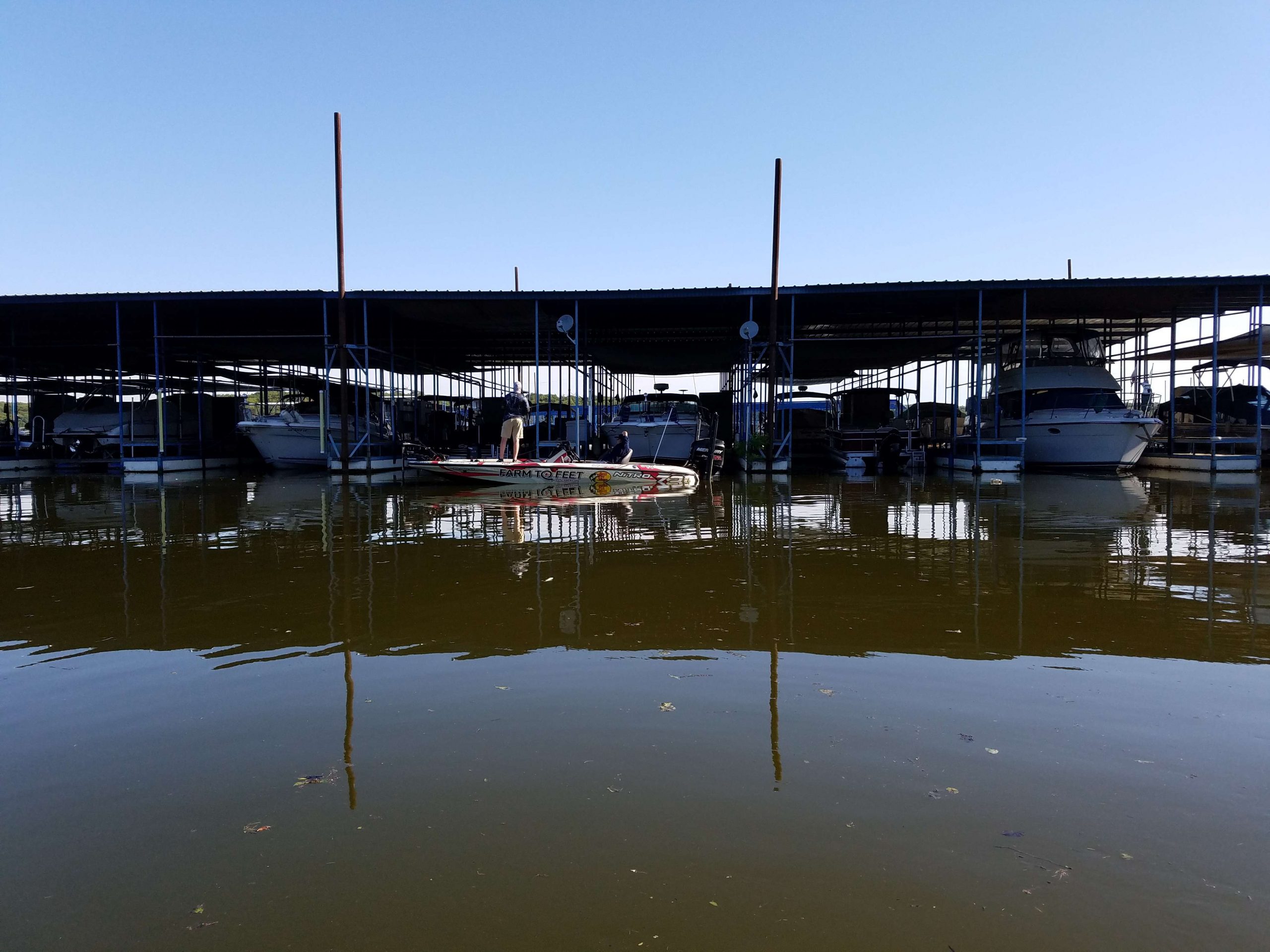 Andy Montgomery is working a boat dock near a marina. This area was devastated by flooding 3 years ago according to Frank, my boat driver. The current high water is nothing compared to that flood, Frank says. As we watch Andy fish we hear the constant sound of construction in the background. They are rebuilding as we speak.