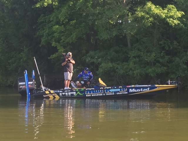 Brandon Lester is on the board. At 8:10 he caught his first bass, in the 2 and a half pound range. And on the very next cast he caught his second keeper from the same hole. This one was in the 1 and a half pound range. After nearly two hours of fishing, and no catching, he made a slight change in strategy and it paid off. “I was starting to get worried,” he said. “Really glad to get on some fish.”