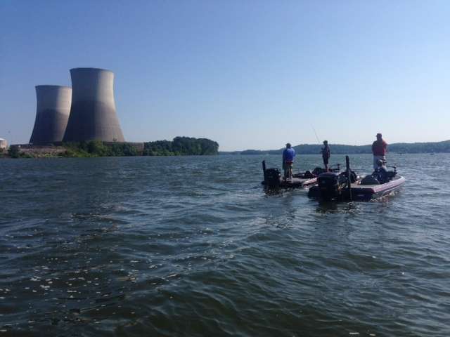 Russ Lane is the only Amigo left here now. That's him in the photo alongside Mark Zona, James Hall and Tommy Sanders. Jeff Kriet is now fishing north of here and KVD headed the other direction. We are wondering if he has trolling motor issues. After he pulled it up, we watched Kevin messing around with the trolling motor. Could he be headed to a nearby ramp to have it checked?