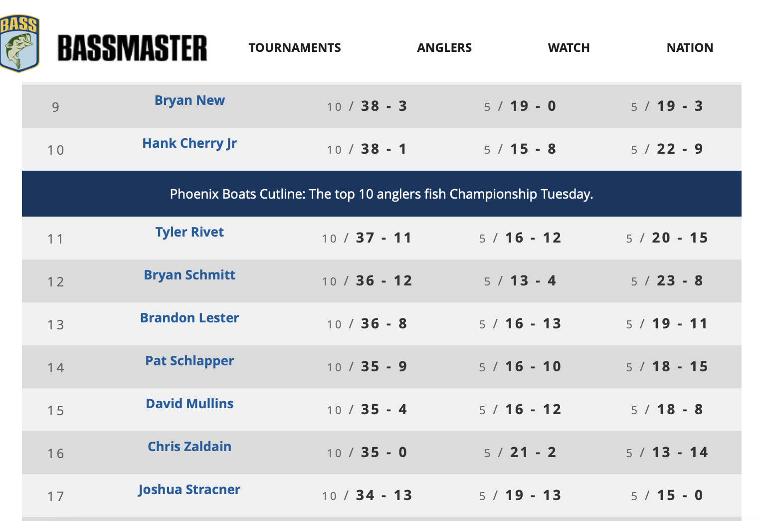 Hank Cherry is 10th with 38 pounds, 1 ounce on the Leaderboard after Sunday. Six places outside the Phoenix Boats Cutline is Chris Zaldain, with 35 pounds. With only 3 pounds separating 10th from 16th (and a few spots beyond), the opportunity to springboard into Championship Tuesday is real.
