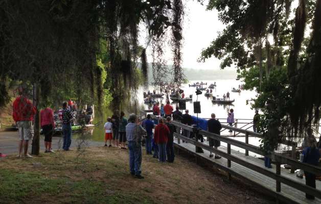 Fans and family find a flooded picnic area for a good view of launch.