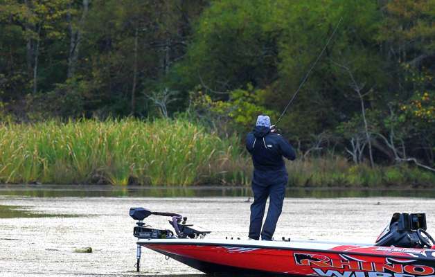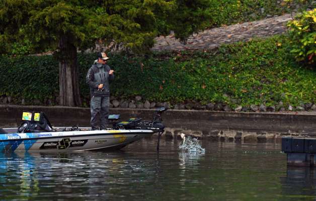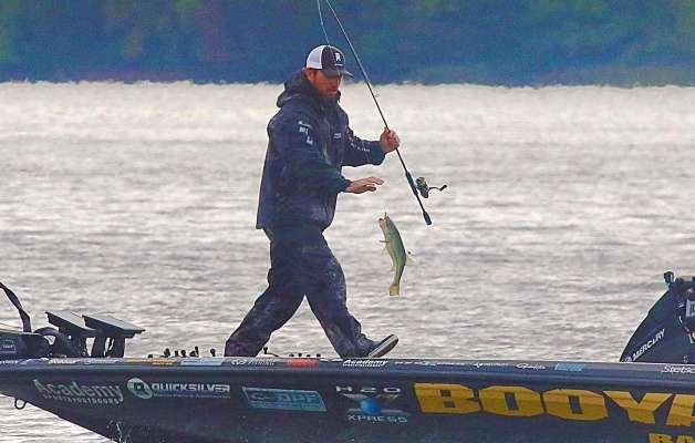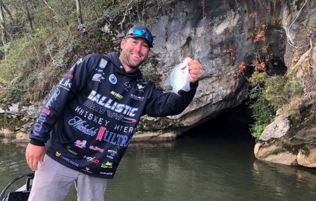Following a rather tough practice, Elite Series Pro Lee Livesay has put three fish in the boat this morning and just caught a decent crappie out of the cave behind...