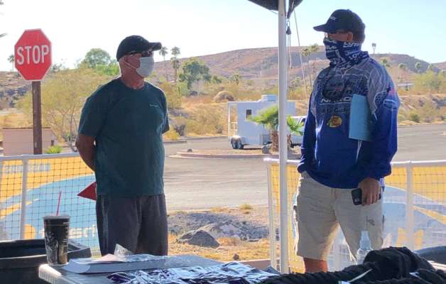 Utah State president Rick Culver, left, and Arizona team captain Steve Lund discuss the fishing on Lake Mead while they wait their turn to register their teams.