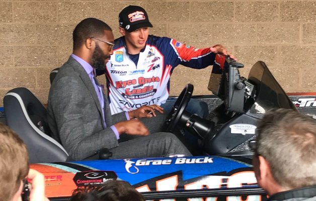 Birmingham Mayor Randall Woodfin received a quick bass boat tour from Bassmaster Classic competitor Grae Buck during Classic Media Day. Buck explained the controls and showed the mayor more features...