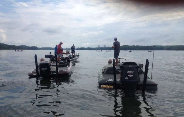 Russ Lane, Jeff Kriet and Kevin VanDam have been fishing together all morning. We're estimating their order like this: 1) Lane with 20+ pounds, 2) Kriet with a little less...