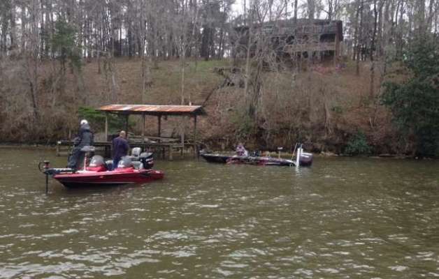 Brett Hite is now fishing a series of boat docks. Photograher James Overstreet and I are noticing that the water has dropped about four inches since early this morning, by looking at...