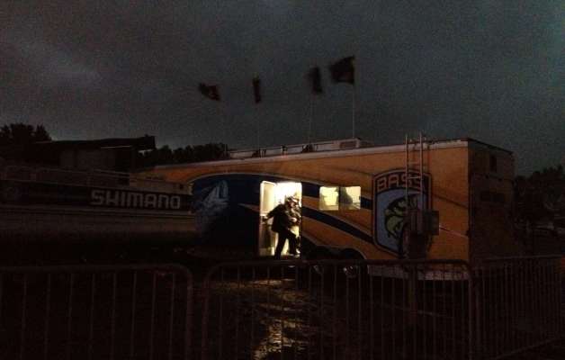 With heavy rain falling and thunder and lightning in the sky, B.A.S.S. has postponed this morning's launch in La Crosse, Wisc.